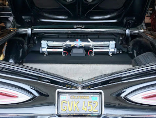 One of our local customers brought his '59 Impala to us this week for a simple air suspension installation. We used Air Lift's 3P system, with a polished aluminum 5 gallon tank and dual Viair 444C compressors. The car is going to the upholstery shop from here for a new interior and a trunk build-out, so we kept everything simple with a carpeted panel under the package tray to mount all of the components.